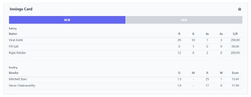 π Detailed Scorecard: Access a comprehensive scorecard that breaks down each player's contribution, including runs scored, balls faced, overs bowled, and wickets taken.